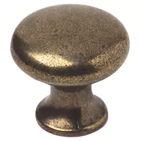 Traditional round cabinet knob with an antique brass effect finish.