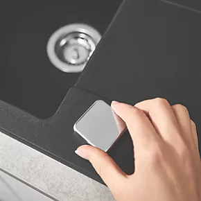 Durable, top-mounted composite sink with drainer. Offers easy maintenance, hard-wearing finish, hygienic surface and internal bowl depth of 20cm. Fully reversible to mount to left or right and cast in 80% quartz / 20% acrylic resin and hardener composite material. Resistant to stains, scratches, heat and dents. Supplied with waste kit, automatic waste fitting with rotary handle, basket strainer waste and mounting set.